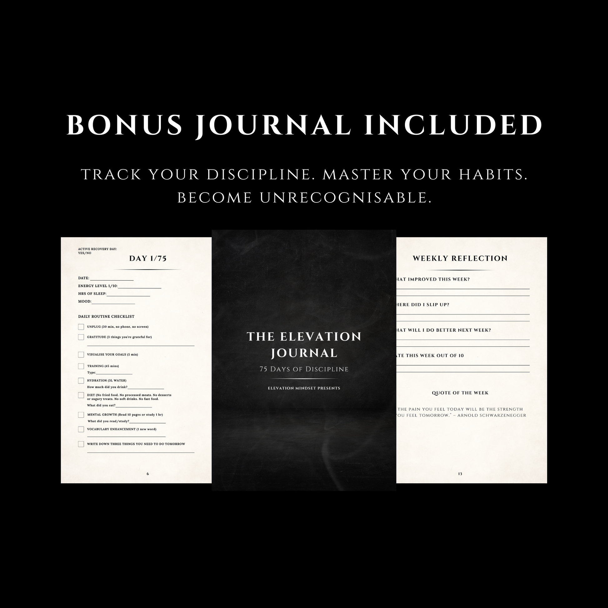 Includes the 75-Day Transformation Journal — your daily companion to stay locked in, track your progress, and witness your evolution one day at a time.